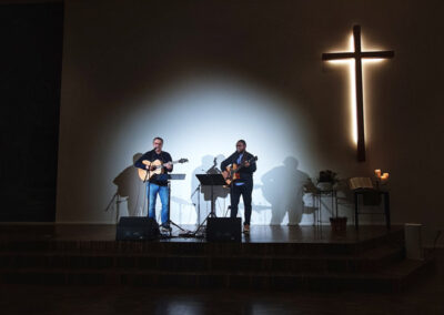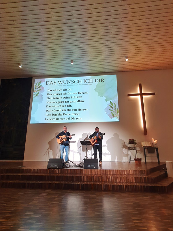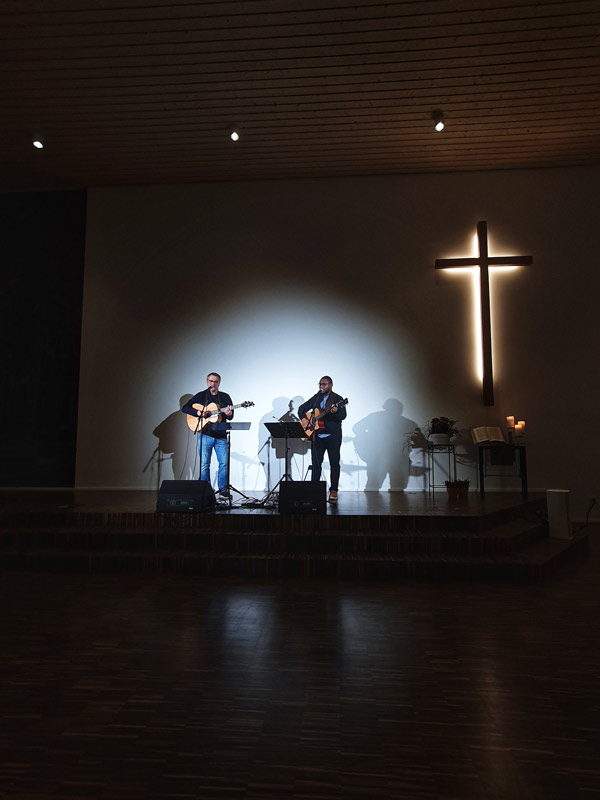 Am 15. November waren Martin Buchholz und Sam Samba mit ihrem Programm „Hallo Leben! Lieder und Geschichten zum Aufatmen“ bei uns zu Gast. Schon vor Beginn des Konzerts war in unserem Gottesdienstraum das pure Leben zu spüren. Viele Menschen aus unserer Gemeinde und einige Gäste, insgesamt etwas mehr als 100 Personen, saßen gut gelaunt mit Kaltgetränken in Sitzgruppen und unterhielten sich angeregt.