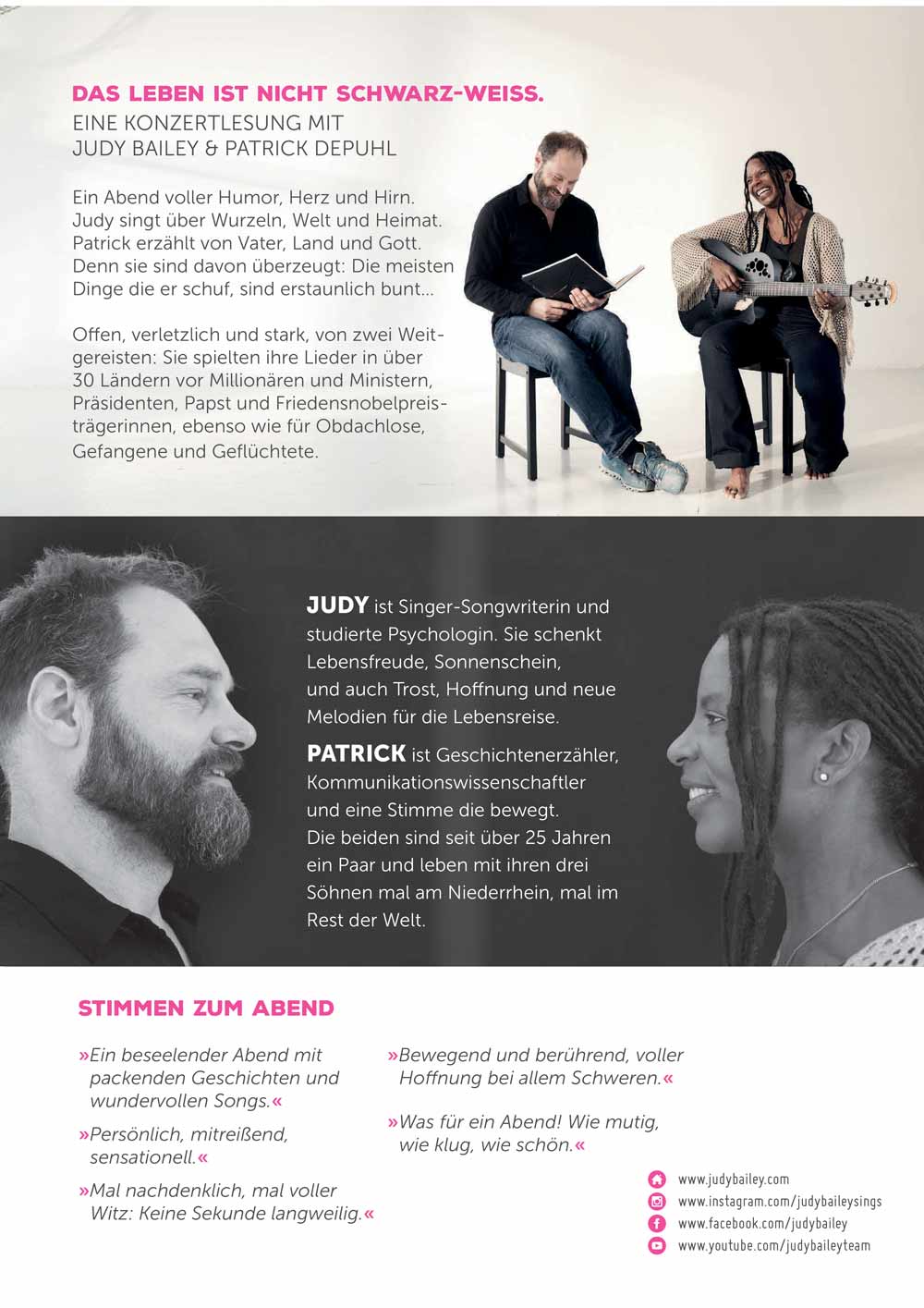 „Die Wiege der Menschheit, da liegen meine Wurzeln. Hab ne Großfamilie, mehr als acht Milliarden. Mein Vaterland heißt: Kunterbunte Mutter Erde. Trage so wie alle diese eine Farbe: Farbe Mensch, Farbe Mensch.“ Dieses Lied hat mich berührt, weil es mit einem Augenzwinkern in den Strophen dazu anregt, auf das zu schauen, was uns verbindet, und daraus eine offene, wertschätzende Haltung füreinander zu entwickeln. Den beiden Künstlern gelang es, trotz aller Tiefgründigkeit, immer wieder für herzhaftes Lachen im Publikum zu sorgen. Nach dem Konzert blieben einige Gäste noch lange und ließen mit Wein und Co den Abend ausklingen.
